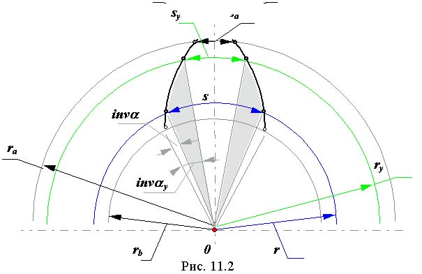 Угловая толщина зуба по окружности произвольного радиуса из схемы на рис. 11.2