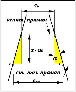 Так как стночно-начальная прямая перекатывается в процессе огибания по делительной окружности без скольжения, то дуга s-s по делительной окружности колеса равна ширине впадины e-e по станочно-начальной прямой инструмента. Тогда, c учетом схемы на рис. 12.5, можно записать