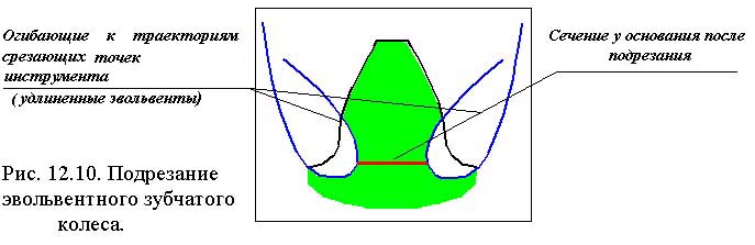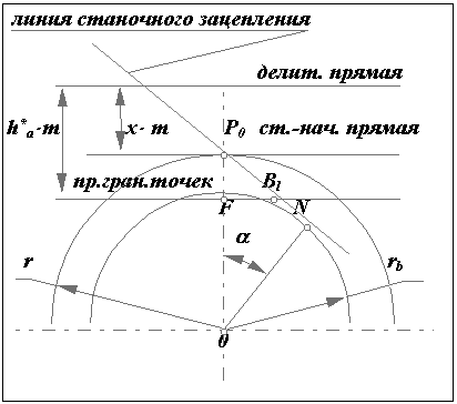 В процессе формирования эвольвентного зуба по способу огибания, в зависимости от взаимного расположения инструмента и заготовки возможно срезание эвольвентной части профиля зуба той частью профиля инструмента, которая формирует переходную кривую. Условие при котором это возможно определяется из схемы станочного зацепления. Участок линии зацепления, соответствующий эвольвентному зацеплению определяется отрезком B1. где точка Bl определяется пересечением линии станочного зацепления и прямой граничных точек инструмента. Если точка Bl располагается ниже (см. рис.12.8) точки N, то возникает подрезание зуба. Условие при котором нет подрезания можно записать так