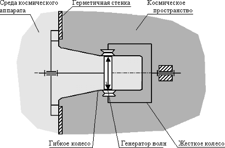 Гибкое колесо обеспечивает волновым передачам возможность передачи движения через герметичную стенку, которая разделяет две среды (например, космический аппарат и открытый космос). При этом гибкое колесо выполняется как элемент герметичной стенки, входной вал и генератор волн располагаются по одну сторону стенки (внутри космического аппарата), а выходное звено – по другую (в космическом пространстве). Схема герметичной волновой передачи приведена на рис. 18.2.