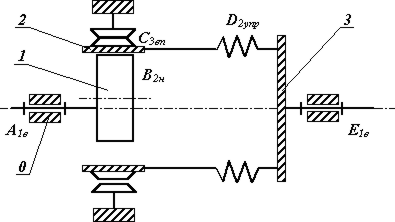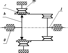 Рассмотрим одноволновую зубчатую передачу с генератором волн, который образует с гибким колесом пару скольжения. Волновая передача не может рассматриваться в рамках ранее принятых нами допущений, так как в ней содержится гибкое звено. Поэтому необходимо определить место гибкого элемента в структуре механизма. Гибкая связь обычно допускает по действием силовых воздействий определенные относительные перемещения соединяемых звеньев. Поэтому ее отнесем к отношениям между элементами или к упругой кинематической паре. Зубчатое колесо представляет собой замкнутую систему зубьев. В каждый рассматриваемый момент в контакте в высшей паре могут находится один или несколько зубьев. Так как зубчатые колеса – звенья, то зубья – элементы высшей кинематической пары. Поэтому многопарный контакт между зубчатыми колесами является контактом между элементами одной кинематической пары. Пассивные или избыточные связи, возникающие в этом контакте, относятся к внутренним связям кинематической пары и в структурном анализе на уровне звеньев не учитываются. Поэтому считаем, что в зацеплении находится один зуб. Структурная схема механизма с остановленным жестким колесом при гибком соединении зуба с валом гибкого колеса может быть представлена следующем образом.