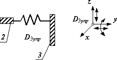 D3упр – двухподвижный упругий шарнир (рис.18.6). Данная кинематическая пара должна обеспечивать зубу гибкого колеса 2 возможность выполнять движения деформации относительно вала 3, но относительные движения в тангенциальном направлении (по оси х) запрещены. Аналогичные движения обеспечивает пара D3муф в зубчатом соединении в волновой зубчатой муфте и пара С3вп в волновом зубчатом зацеплении (рис.18.7).