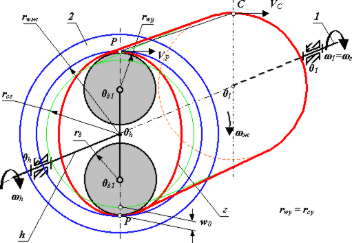 В движении звеньев относительно генератора волн скорости звеньев равны угловым скоростям в движении относительно стойки минус угловая скорость генератора. Скорость точки жесткого колеса, совпадающей с полюсом зацепления VPж = (wж- wh) × rwж,а скорость точки, совпадающей с полюсом на гибком колесе VPг = (wг- wh) × rwг