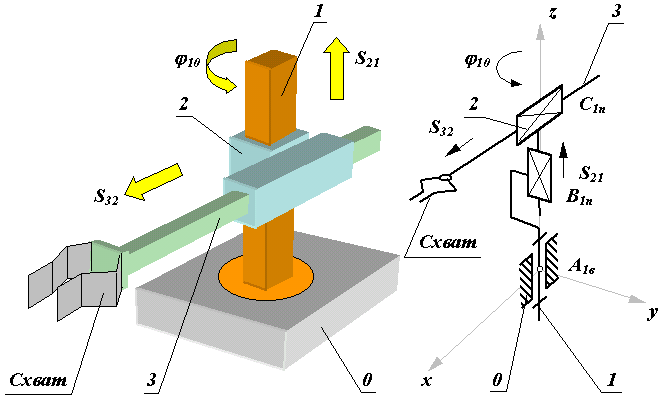 Рассмотрим для примера структурную и функциональную схемы промышленного робота с трехподвижным манипулятором. Основной механизм руки манипулятора состоит из неподвижного звена 0 и трех подвижных звеньев 1, 2 и 3 (рис.19.1).