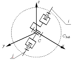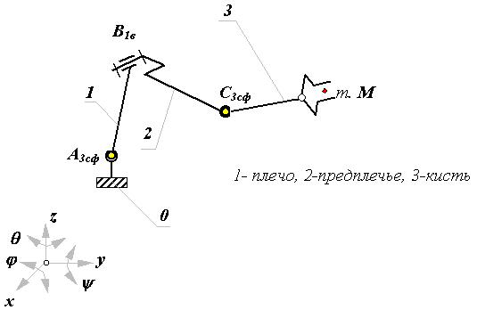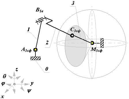 Этот механизм состоит из трех подвижных звеньев и трех кинематических пар: двух трехподвижных сферических А3сф и С3сф и одной одноподвижной вращательной В1в.