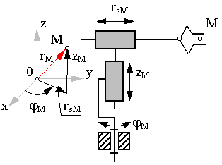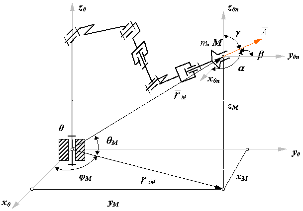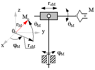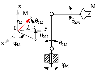В соответствии с этой классификацией движений, в манипуляторе можно выделить два участка кинематической цепи с различными функциями: механизм руки и механизм кисти. Под "рукой" понимают ту часть манипулятора, которая обеспечивает перемещение центра схвата – точки М (региональные движения схвата); под "кистью" – те звенья и пары, которые обеспечивают ориентацию схвата (локальные движения схвата).