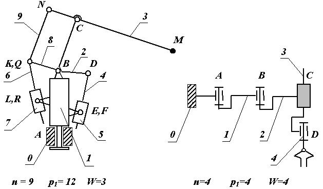 - для привода звена 3 - цепь, состоящая из кулисного механизма (звенья 6,7 и 8) и шарнирного четырехзвенника (звенья 8,9,2 и 3).