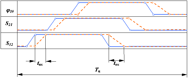 где V32n, a32n - относительная скорость и относительное ускорение звеньев в момент останова. Однако это осуществимо только в регулируемом приводе при контурном управлении. Кроме того при безударном останове в конце хода относительная скорость близка к нулю, поэтому время перемещения схвата в требуемое положение значительно возрастает. Компромиссным решением является останов с мягким ударом, при котором относительная скорость в конце хода V32n= 0, а ускорение ограничено некоторым допустимым значением a32n <= [a]. В механизмах с цикловым управлением режим движения с мягким ударом обеспечивается установкой упоров с демпферами, гасящими кинетическую энергию руки. Расчет демпфера ведется из условия ASn =0, которое обеспечивается равенством за цикл движения работы движущей силы AFд3 и работы силы сопротивления демпфера АFc (рис. 20.6б):