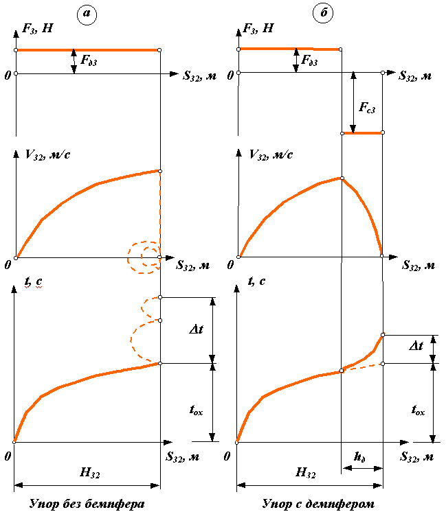 При остановке на упоре без демпфера, скорость звена 3 должна мгновенно уменьшится с некоторого конечного значения до нуля. При таком изменении скорости ускорение a32 стремится к бесконечности. Такая остановка звена называется жестким ударом. Она сопровождается большими динамическими нагрузками на звенья механизма. Так как реальный манипулятор представляет собой упруго-инерционную систему, то эти нагрузки вызовут отскок звена 3 от упора, а также колебания всего механизма. Схват будет совершать колебания относительно заданного конечного положения. Время затухания этого процесса D t (рис.20.6а) значительно снижает быстродействие ПР.