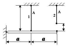 - Жесткий брус ВД подвешивается на трех титановых стержнях, каждый из которых короче проектной длины на 0,1%. Если Е = 100 ГПа, то после сборки системы наибольшее монтажное напряжение составит (в МПа)