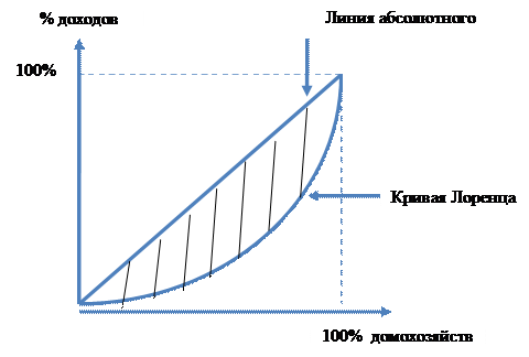 В рыночной экономике доходы распределяются неравномерно. Для измерения фактического распределения доходов используют «кривую Лоренца» и «коэффициент Джини», показывающие, какая доля совокупного дохода приходится на каждую группу населения, что позволяет судить об уровне экономического неравенства в данной стране. «Кривая Лоренца» — это метод графического изображения уровня концентрации явления, с помощью которого в экономической теории выражают степень дифференциации доходов (рис. 11.1).