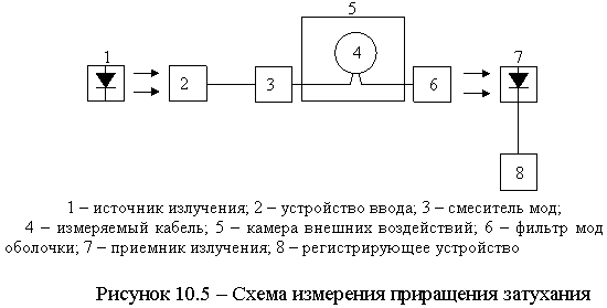 · образец измеряемого кабеля помещают в камеру внешних воздействий и выводят из установки оба конца измеряемого кабеля на длину, необходимую для подключения к источнику и приемнику излучения;