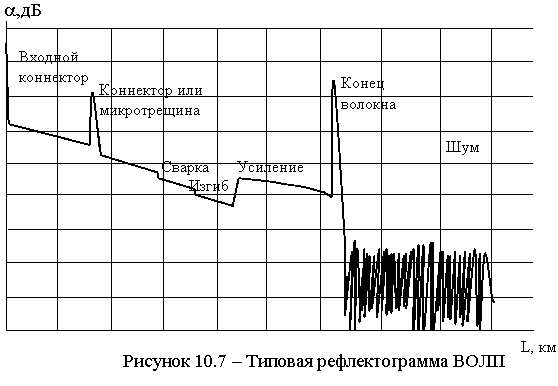 При реализации этого метода измеряемое волокно зондируют оптическими импульсами, вводимыми в ОВ через оптический направленный ответвитель. Из-за флюктуаций показателя преломления сердцевины вдоль волокна, отражений от рассеянных и локальных неоднородностей, распределенных по всей длине волокна, возникает поток обратного рассеяния. Измеряют уровень мощности этого потока в точке ввода оптических зондирующих импульсов в волокно в зависимости от времени задержки относительно момента посылки зондирующего импульса. В результате получают распределение мощности обратнорассеянного потока вдоль волокна – характеристику обратного рассеяния волокна. Регистрируют отдельные реализации характеристики обратного рассеяния, усредняют их по некоторому количеству зондирующих импульсов, а усредненное значение выводят на устройство отображения для дальнейшего анализа. Изображение характеристики обратного рассеяния на экране дисплея называется рефлектограммой, рисунок 10.7.