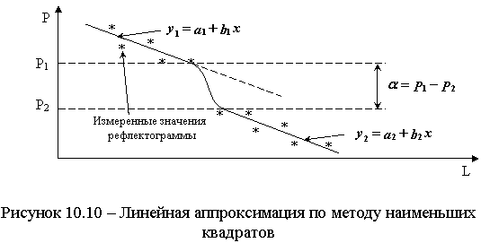 Измерения потерь в сварных соединениях. Этот вид потерь может быть вызван как отражательными, так и неотражательными событиями. В идеале потери данного типа должны иметь вид резкого изгиба рефлектограммы. Однако изменение модового состава оптического излучения и отражения в месте соединения приводит к искажению рефлектограммы в некоторой зоне вблизи места соединения. Протяженность этой зоны достаточно велика (100…200 м), поэтому оценки затухания стыка, полученные непосредственно как разность результатов измерения обратнорассеянной мощности до и после стыка, имеют большую погрешность, которая может достигать 100 % и выше. В этой связи, а также в целях уменьшения влияния собственных шумов на погрешность измерения затухания в современных рефлектометрах эффективно используются алгоритмы аппроксимации фрагментов рефлектограммы линейной (регрессионной) зависимостью по методу наименьших квадратов, рисунок 10.10.