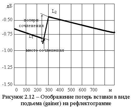 Если выполнено сращивание волокон с различными коэффициентами затухания, то углы наклона аппроксимирующих прямых будут различны. Возможен также случай, когда обратное рассеяние после события выше, чем до него, возможен подъем “gainer” (рисунок 10.12) в месте изгиба рефлектограммы.