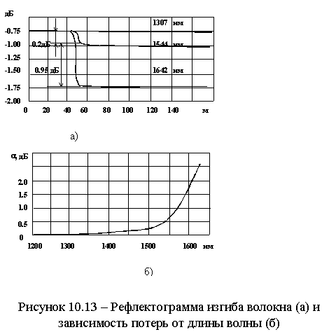 Измерение потерь на изгибах оптических волокон. При изгибе волокон с увеличением длины световой волны тип колебаний, распространяющихся в волокне, становится менее ограничен высоколегированной сердцевиной, а эти параметры становятся значимыми. Пример зависимости потерь от изгиба одномодового волокна, намотанного вокруг стержня диаметром 23 мм, при различных длинах волн приведен на рисунке 10.13 [14]