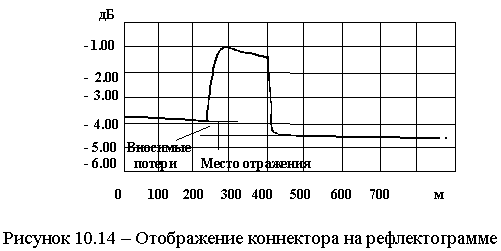 Измерение потерь отражательных событий. Отражения в оптическом кабеле могут быть вызваны изменениями показателя преломления, например, воздушным зазором в микротрещине, механическим сращиванием или коннектором. К дополнительным потерям приводят также некачественное соединение коннекторов, несовпадение диаметров сердцевины или цифровой апертуры, а также неконцентричность сердцевины волокна. На рисунке 10.14 представлен вид вносимых потерь коннектора, составляющих приблизительно 0,4 дБ, измеренных импульсным рефлектометром. Слегка наклонная вершина импульса указывает на то, что данная форма представляет собой сумму отраженного и трансформированного вследствие потерь прямоугольного сигнала обратного рассеяния [14].