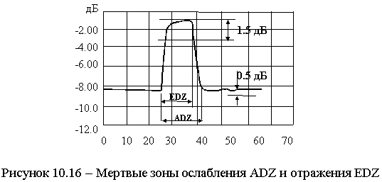 · мертвая зона отражения определяется расстоянием между началом и точкой с уровнем – 1,5 дБ от вершины понижающегося отрезка кривой отражения, после чего последующие отражательные события могут быть легко идентифицированы;
