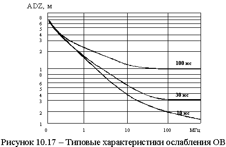 Таким образом, смысл термина “мертвая зона” заключается в количественном определении расстояния, на котором после значительного отражения происходит потеря информации. Обычно при определении мертвой зоны используется отражение уровнем 35 дБ, что соответствует приблизительно 0,33% отраженной в данной точке оптической мощности, которая суммируется с мощностью обратного рассеяния, являющейся функцией выбранной длительности импульса. Таким образом, действительная высота, видимая на экране OTDR, зависит как от коэффициента отражения, так и от длительности импульса данного волокна. Как следует из уравнения, меньшая длительность импульса не обязательно может привести к укорочению мертвых зон, т.к. по мере сужения импульса разница между уровнем обратного рассеяния и вершиной отражения увеличивается. При этом с ограничением ширины полосы пропускания приемника увеличивается экспоненциально падающий участок рассматриваемой кривой, а это приводит к существенному увеличению мертвой зоны. Учитывая, что короткие импульсы снижают SNR, мертвая зона ослабления OTDR, как правило, указывается для наиболее коротких импульсов. На рисунке 10.17 приводится сравнение минимально достижимых мертвых зон ослабления для трех длительностей импульса функций полосы рабочих частот приемника. График построен для 35 дБ отражения типового одномодового волокна при l=1310 нм с использованием базовой низкоскоростной модели идеального приемника. Как следует из графика для таких одномодовых OTDR с диапазоном рабочих частот приёмника от 1 до 10 МГц, кривые начинают совмещаться в области низких частот что, с точки зрения мертвой зоны ослабления, указывает, скорее, на ограничение диапазона рабочих частот, чем на ограничение продолжительности импульса. При диапазоне рабочих частот приемника, равной 10 МГц, значения мертвой зоны для 10 нс и 30 нс незначительно отличаются друг от друга, поэтому улучшение SNR на +2,4 дБ при более широких импульсах тестирования имеет явное преимущества, т.к. приводит к почти десятикратному увеличению скорости измерения. При ориентации на 3 мертвую зону с использованием одномодового OTDR необходима ширина полосы рабочих частот приемника составляющая приблизительно 50 МГц.