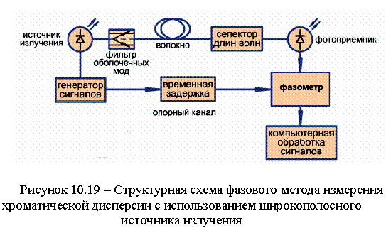 В случае использования измерителя хроматической дисперсии с перестраиваемой рабочей длиной волны необходимо установить границы спектрального диапазона и шаг изменения длины волны. Структурная схема фазового метода измерения хроматической дисперсии с использованием широкополосного источника излучения и фотоприемника с селектором длин волн представлена на рисунке 10.19.