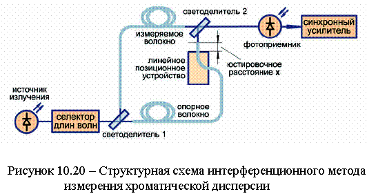 Излучение от широкополосного источника после селектора длин волн попадает в интерферометр Маха–Цандера. При линейном перемещении конца волокна, входящего в состав опорного плеча интерферометра, в опорный канал вносится известная разность оптических длин, значение которой позволяет вычислить групповую задержку светового сигнала в тестируемом волокне, расположенном в измерительном плече интерферометра. Интерферометрический метод применяется при измерении характеристик коротких отрезков волокна длиной несколько метров и в основном используется для контроля производственного процесса при изготовлении волокон и компонентов систем передачи.