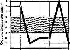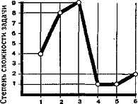 Проявлением аффекта неадекватности является также несоответствие между результатами решения задач и поведением подростка. Так, шутливые высказывания, излишнее неестественное оживление, небрежный тон вопросов о результатах были свойственны тем детям, которые по предварительной беседе и первому выбору проявили высокий уровень притязаний, но затем столкнулись с неуспехом. Чаще всего такие ученики резко снижают уровень сложности задания, как бы стараясь достичь успеха любой ценой (хотя бы и на низком уровне сложности), но затем, в конце эксперимента, пытаются снова вернуться на недоступный для них уровень, игнорируя зону средней сложности, предназначенную для их возраста. Приведем в качестве примера график решения задач Юрой С., 13 лет.