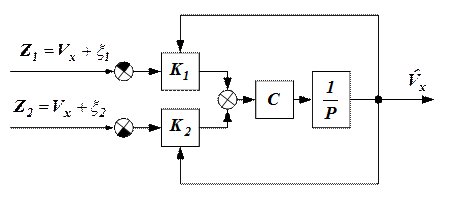 Таким образом, для данной задачи показана возможность предварительного комплексирования измерителей без нарушения оптимального фильтра. Но для получения оптимальной оценки недостаточно просто использовать выход комплексного измерителя