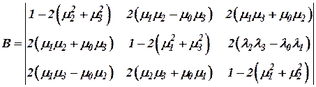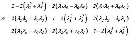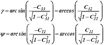 При создании БИНС наиболее часто в качестве таковых используются параметры Родрига-Гамильтона (кватернионы). Матрица пересчета из связанной в географическую систему координат получается путем перемножения двух матриц, из которых одна пересчитывается в связанных в инерциальные оси – вторая из инерциальных в географические. Каждая из двух матриц вычисляется на основе параметров Родрига-Гамильтона, которые в свою очередь определяются численным алгоритмом второго порядка, построенным на основе метода последовательных приближений Пикара: