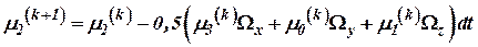 - приращения интегралов от проекций абсолютной угловой скорости поворота объекта на оси чувствительности гироскопов (показания гироскопов БИНС, измеряющих не проекции угловых скоростей, а приращение углов поворота вокруг своих осей чувствительности).