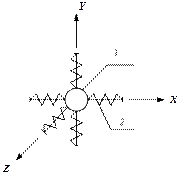 Предположим, что на движущейся вблизи поверхности Земли объекте установлен трехкомпонентный акселерометр. Модель такого акселерометра можно представить в виде материальной точки единичной массы (чувствительного элемента), установленной в трехкомпонентном упругом подвесе (рис. 1).