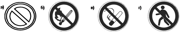 Рис. 1. Запрещающие знаки: а- общий вид знака; б- запрещается пользоваться открытым огнем; в- запрещается курить; г- вход (проход) запрещен.