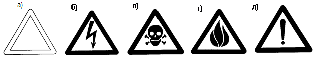 Рис. 2. Предупреждающие знаки: а- общий вид знака; б- осторожно! электрическое напряжение; в- осторожно! ядовитые вещества; г- осторожно! легко воспламеняющиеся вещества; д- осторожно! прочие опасности.