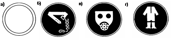 Рис. 3. Предписывающие знаки: а- общий вид знака; б- работать в предохранительном поясе!; в- работа с применением средств зашиты органов дыхания!; г- работать в защитной одежде!