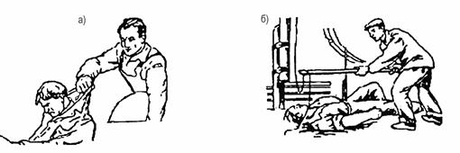 • освободить пострадавшего от действия электрического тока, соблюдая необходимые меры предосторожности; при отделении пострадавшего от токоведущих частей и проводов нужно обязательно использовать сухую одежду или сухие предметы, не проводящие электрический ток (рис. 15);