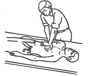 · ритмично, толчкообразно, всем весом своего тела (руки выпрямлены в локтевых суставах) надавливать на грудину, смещая ее строго вертикально вниз на 3 – 4 см, с продолжительностью надавливания не более 0,5 с и с интервалом надавливания не более 0,5 с. После каждого надавливания на грудину быстро поднять руки, итак 60 – 70 раз в минуту;