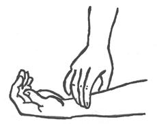 положить ладонь одной руки на нижнюю треть грудины пальцами к левому соску пострадавшего. Ладонь второй руки наложить поверх первой накрест (рис. 16). Пальцы рук не касаются поверхности тела пострадавшего;