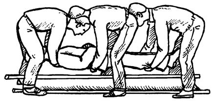 Поднимать пострадавшего и укладывать на носилки необходимо согласованно, лучше даже по счету, по команде. Брать пострадавшего следует с одной стороны (здоровой), стоя на одном колене, подсунув руку под спину так, чтобы пальцы оказались у другого его бока. По возможности не следует переносить пострадавшего к носилкам, а, не вставая с колен, приподнять его с земли, чтобы кто-нибудь в этот момент подставил под него носилки (рис. 17).