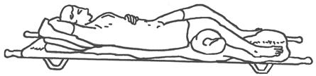 Особенно это важно при переломах. В то же время участок тела в месте перелома кто-нибудь должен поддерживать. При переломе позвоночника, если носилки мягкие, а также при переломе нижней челюсти, если пострадавший задыхается, следует класть пострадавшего лицом вниз. Если повреждены кости таза, ноги пострадавшего несколько разводят в стороны (положение лягушки) и под колени подкладывают плотный валик из скатанной одежды