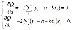 Оценки параметров уравнения регрессии можно получить с помощью метода наименьших квадратов (МНК), который заключается в минимизации суммы квадратов отклонений наблюдаемых значений исследуемой характеристики у от ее значения, рассчитанного по уравнению регрессии для того же значения х.