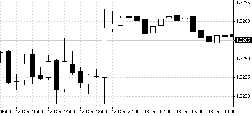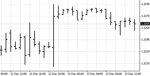 - слева от бара рисуется горизонтальный штрих, соответствующий цене открытия (т.е. цене первой сделки) для рассматриваемого интервала времени;