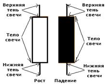 Японские свечи, подобно графикам-барам, служат для отображения сразу четырех ценовых параметров. В этом случае над временной координатой строится прямоугольник, который называется "телом" свечи, с вертикальными штрихами сверху и снизу, называемыми "фитилями" или "тенями". Горизонтальные стороны соответствуют ценам открытия и закрытия, верхняя точка верхнего фитиля соответствует максимальной цене, нижняя точка нижней тени – минимальной. Если цена открытия больше цены закрытия свечи закрашиваются черным цветом. В противном случае тело свечи не закрашивается, а остается белым. В случае равенства цен закрытия и открытия тело вырождается в горизонтальный штрих, а сама свеча приобретает вид крестика – "доджи".
