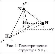 Рассмотрим операции симметрии на примере молекулы аммиака NH3. Геометрическое строение этой молекулы - тригональная пирамида, в основании которой лежат атомы водорода, образующие правильный треугольник. [Нарисовать структуру и пронумеровать атомы водорода как показано на рис. 1]. При операциях симметрии происходит взаимозамещение атомов водорода; атома азота остается неподвижным. Поэтому для иллюстрации операций симметрии рассмотрим только атомы водорода и для этого их пронумеруем (рис.1). [Далее подробно рассмотреть действие операций симметрии E, C3, C3 2, sv, sv¢, sv² в соответствии с рис. 2]. Оси поворота проходят по оси z, плоскости включают ось поворота и один из атомов водорода (см. рис. 2). Поворот - по часовой стрелке.
