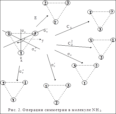 Таким образом операции симметрии NH3 удовлетворяют групповым постулатам и составляют математическую группу. Аналогичная ситуация имеет место и для любых других систем. Группы, описывающие симметрию ядер молекулы, называются точечными, т.к. все элементы симметрии пересекаются, по крайней мере, в одной точке.