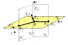 B – D3h; F1 – C2v (операции симметрии – E, C2, sh, sv); F2 – C2v (E, C'2, sh, s'v);