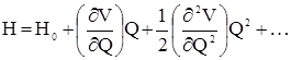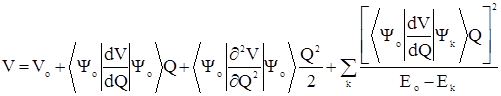 Для решения этой задачи необходимо знать выражении связывающее V и Q и имеющее члены, зависящие от симметрии. Выберем точку на поверхности и будем считать, что уравнение Шредингера решено и известен набор энергетических уровней Е0, Е1,….,Еk и соотвестствующих волновых функций Y0, Y1,….,Yk. Сместим ядра вдоль нормальной координаты Q. Новой значение энергии можно рассчитать с помощью теории возмущения 2-го порядка. При этом Гамильтониан можно записать в виде разложения в ряд Тейлора: