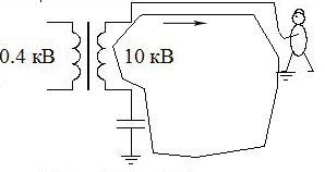 Эти напряжения представляют собой относительную опасность и регламентируются величиной сопротивления защитного заземляющего устройства. Гораздо большую опасность вызывает прикосновение к токоведущим частям. Например, при прикосновении к выводу трансформатора (рис. 2.13) (испытание обратным напряжением) необходимо учитывать влияние емкости вывода и обмотки относительно земли.