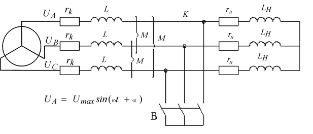 Рассмотрим переходный процесс при трехфазном КЗ, вызываемом выключателем В (рис. 3.1). Ток режима, предшествующего короткому замыканию, может быть определен как: