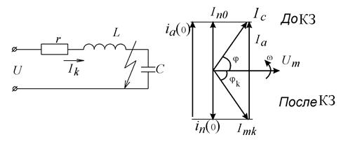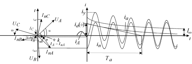 Проекции векторов напряжений и токов на ось времени определяют их мгновенные значения. Угол α между горизонталью и вектором UA называется фазой включения КЗ.
