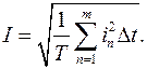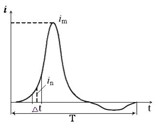 Так как функция i 2 является непрерывной во всем интервале [0, Т ], то интеграл (3.18) можно вычислить методом численного интегрирования с заменой интеграла на конечную сумму. Вычисление проводится путем разбиения интервала от 0 до Т на множество конечных интервалов, приближенным нахождением площади каждой полоски, получающейся при таком разбиении, и дальнейшем суммировании площадей этих полосок. Следовательно, действующее значение тока в этом случае находится по формуле: