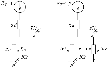 В том случае, когда сопротивление нагрузки не вводят в схему замещения, ее влияние учитывают увеличением ЭДС. В этом случае ток в месте КЗ будет равен току генератора при КЗ, что вносит погрешность в расчет.